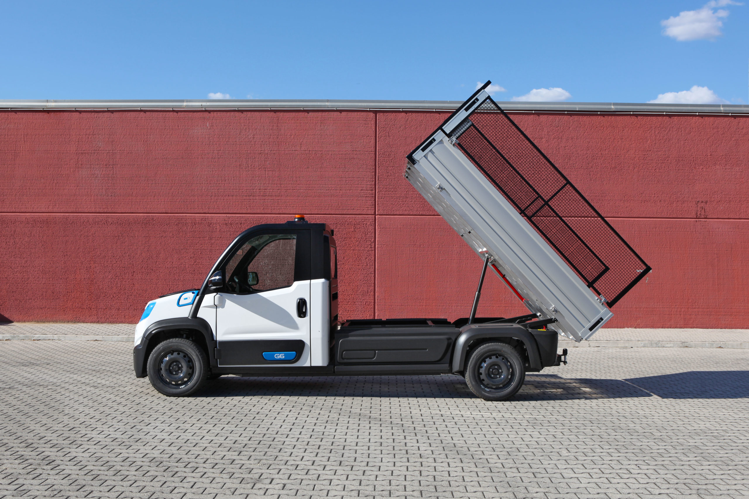 Veicolo elettrico per trasporto merci con ampio piano di carico e cassone ribaltabile per gestione degli ingombri